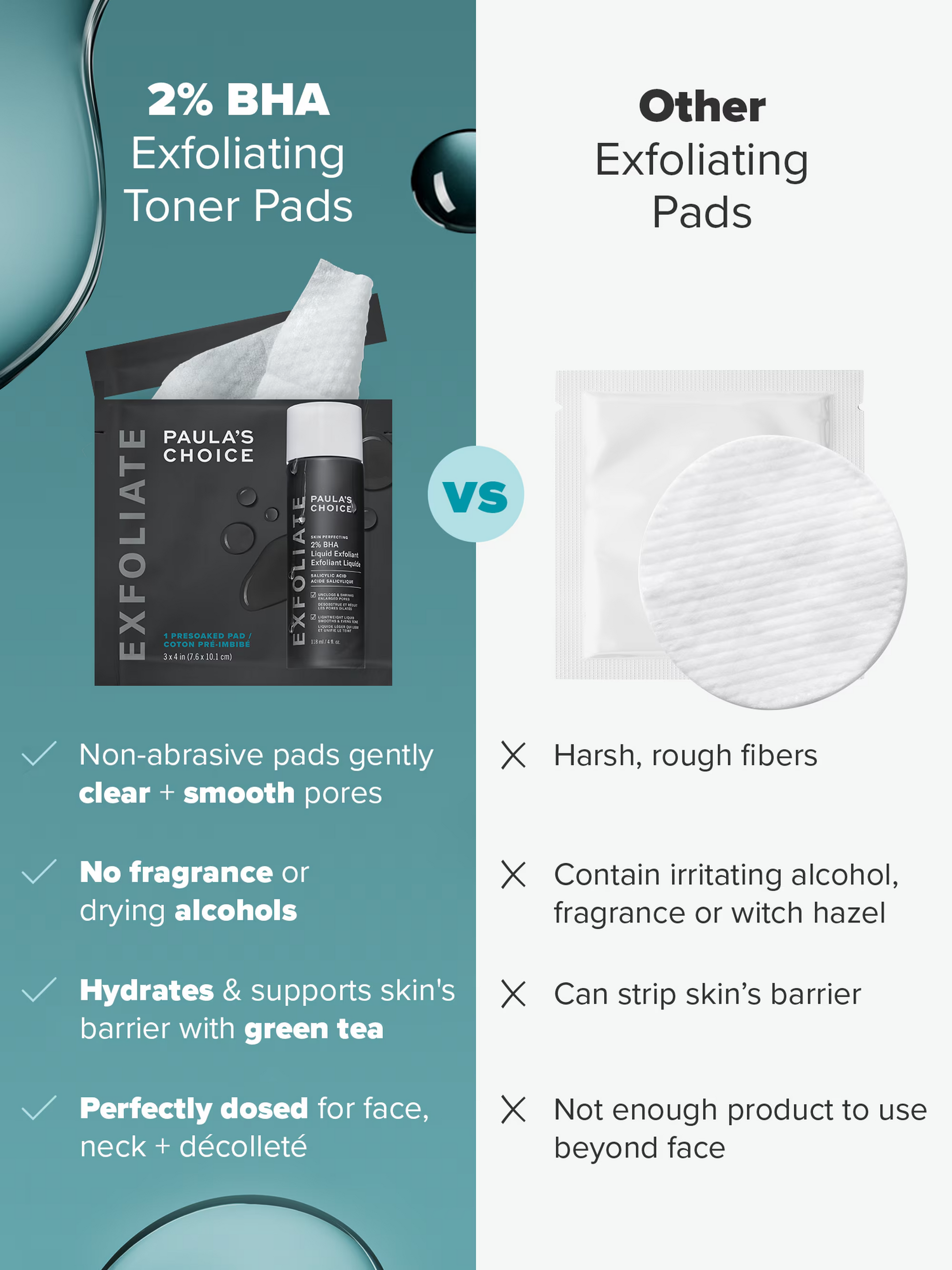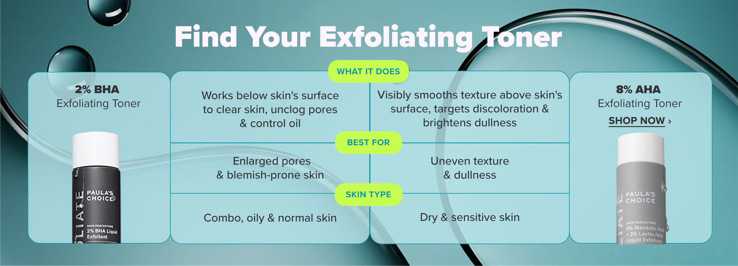 Our 2% BHA Liquid Exfoliant, commonly known as an exfoliating toner, has the lightweight, liquid texture of a toner and the benefits of a chemical exfoliant, which include removing dead skin cells and unclogging pores, revealing a brighter complexion. Other Paula’s Choice tonersare used after cleansing to remove residual makeup and sunscreen, hydrate and deliver targeted ingredients like antioxidants. While both are beneficial, they serve different purposes in your skin care routine.